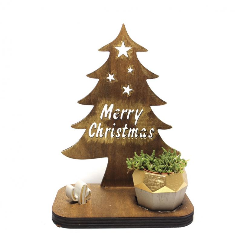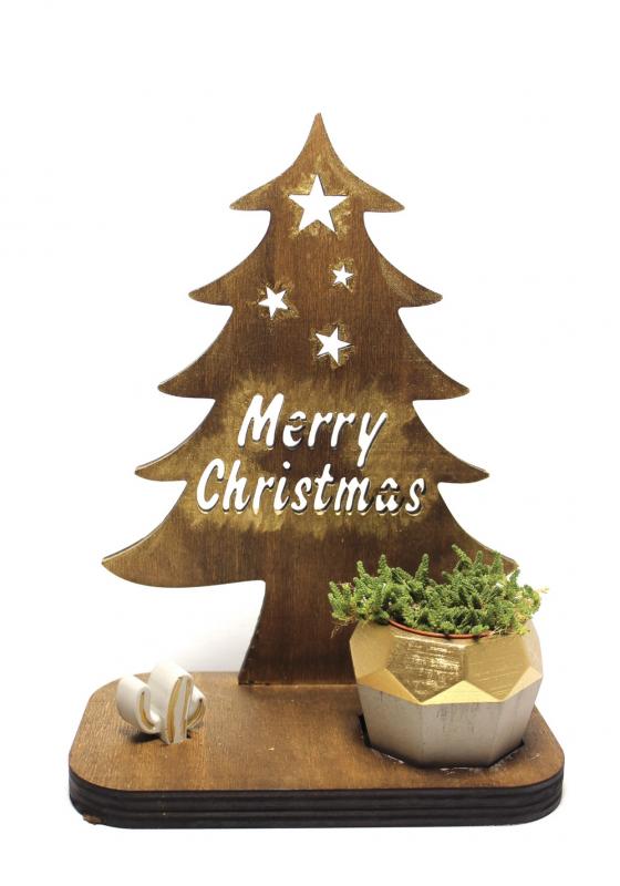 Ahşap Çam Ağaçlı Beton Saksılık, Mutlu Yıllar YazılıHK1612