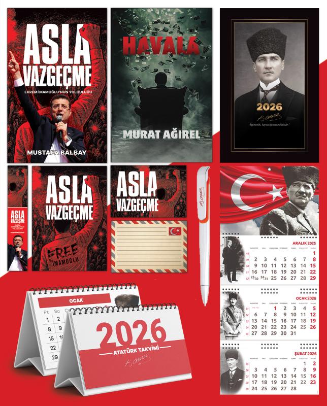 - ASLA VAZGEÇME - MUSTAFA BALBAY "Ekrem İmamoğlu, İstanbul Büyükşehir Belediye Başkanlığı'nı 2019 ve 2024'te üç kez kazandı. Her seferinde, “Daha fazlasını yapabilirim” mesajını verdi. 2023'te Cumhuriyet Halk Partisi'nde değişimin önünü açan kişi olarak, “Türkiye'yi de değiştireceğiz” diye haykırdı. Sırada cumhurbaşkanlığı vardı. Bu hedefe yürürken 23 Mart 2025'te tutuklandı. İmamoğlu önüne her engel konduğunda şöyle haykırdı: “Asla vazgeçmeyeceğim!” Bu söz aynı zamanda tüm Türkiye'ye idi. Tutuklanmasına giden yolla, cumhurbaşkanı adaylığına giden yol Silivri'de kesişti. Esareti göze alarak, cesareti örgütledi. Türkiye ayağa kalktı. CHP Genel Başkanı Özgür Özel, dipten gelen dalgayı uzun soluklu, iktidar hedefli bir yürüyüşe çevirdi. Mustafa Balbay, beş yıl hapis yattığı Silivri Cezaevi'nde İmamoğlu'yla üç kez görüştü. Mücadelesini kendi ağzından dinledi, yazdı. Bu kitapta, gerilimli, sürprizlerle dolu, macera romanlarını aratmayan olaylarla karşılaşacaksınız… Bu kitapta, pes etmeyi hafızasından silmiş, kararlı bir insanı daha yakından tanıyacaksınız… Bu kitapta, Silivri duvarlarına bakınca ufku gören bir liderin uzun yolculuğuna eşlik edeceksiniz…" HAVALA - MURAT AĞIREL • Uyuşturucu kaçakçılığı, göçmen krizi, terör finansmanı... Bu üç büyük sorun nerede buluşuyor? • Türkiye'ye giren uyuşturucu parası nasıl bir yolla aklanıyor? • Uyuşturucu tacirleri ve kara para sahipleri milyonlarca doları yurtdışına çıkarmak için hangi yöntemleri deniyorlar? • Döviz büroları ve kuyumcuların kara para akışındaki rolü ne? • Kokain ticaretinde muz ithalatı neden en kullanışlı yöntem? • Varlık Barışı'ndan yararlanan suçlular kimler? • Varlık Barışı hangi amaca hizmet etti? • Her geçen gün gelişen teknolojiye rağmen, uluslararası suç örgütleri neden “geleneksel” para aktarma sistemini kullanıyorlar? • Tüm dünyayı ilgilendiren “Havala” nedir? Türkiye'de kimler kullanıyor? Gazeteci Murat Ağırel, bu kitapta Türkiye'de son yıllarda giderek daha sık duyduğumuz para transferi sistemi “Havala”yı ve kara paranın nasıl aklandığını masaya yatırıyor. 2026 Atatürk Ajandası • Günlük, haftalık ve aylık olarak bölünmüş • Her gün için Atatürk'ün bir sözü • Amerikan Bristol Kapak • 160 Sayfa • 70g kitap kağıdı 3 Parça Spiralli 2026 Atatürk Gemici Duvar Takvimi • Ürün Ebadı: 27,5x65 cm • Blok Ebadı: 27,5x13,5 cm • Üst Karton Ebadı: 27,5x20 cm • Yapraklar: 80 g 1. Hamur • Alt Karton: 350 g Bristol • Göstergeli 2026 Masa Takvimi Atatürk İmza Baskılı Kalem
