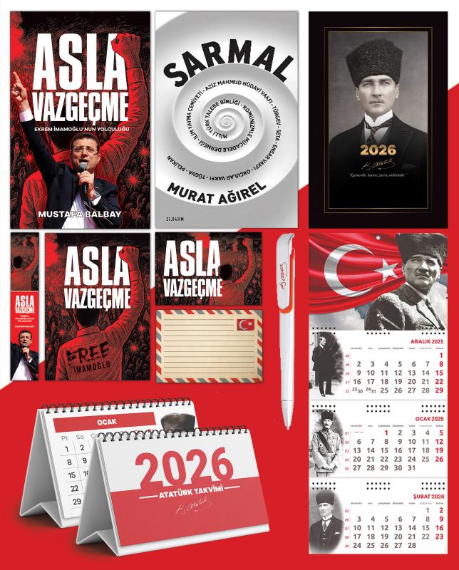 - ASLA VAZGEÇME - MUSTAFA BALBAY "Ekrem İmamoğlu, İstanbul Büyükşehir Belediye Başkanlığı'nı 2019 ve 2024'te üç kez kazandı. Her seferinde, “Daha fazlasını yapabilirim” mesajını verdi. 2023'te Cumhuriyet Halk Partisi'nde değişimin önünü açan kişi olarak, “Türkiye'yi de değiştireceğiz” diye haykırdı. Sırada cumhurbaşkanlığı vardı. Bu hedefe yürürken 23 Mart 2025'te tutuklandı. İmamoğlu önüne her engel konduğunda şöyle haykırdı: “Asla vazgeçmeyeceğim!” Bu söz aynı zamanda tüm Türkiye'ye idi. Tutuklanmasına giden yolla, cumhurbaşkanı adaylığına giden yol Silivri'de kesişti. Esareti göze alarak, cesareti örgütledi. Türkiye ayağa kalktı. CHP Genel Başkanı Özgür Özel, dipten gelen dalgayı uzun soluklu, iktidar hedefli bir yürüyüşe çevirdi. Mustafa Balbay, beş yıl hapis yattığı Silivri Cezaevi'nde İmamoğlu'yla üç kez görüştü. Mücadelesini kendi ağzından dinledi, yazdı. Bu kitapta, gerilimli, sürprizlerle dolu, macera romanlarını aratmayan olaylarla karşılaşacaksınız… Bu kitapta, pes etmeyi hafızasından silmiş, kararlı bir insanı daha yakından tanıyacaksınız… Bu kitapta, Silivri duvarlarına bakınca ufku gören bir liderin uzun yolculuğuna eşlik edeceksiniz…" SARMAL MURAT AĞIREL 1950'li yıllardan itibaren önce ABD destekli sonra Suudi Arabistan sermayesinin katkılarıyla bir “Siyasal İslam” organizasyonu kuruldu. Bu örgüt/organizasyon gelişti, büyüdü, çeşitli kollarıyla ağ gibi ülkemizi sarmaladı. Kadrolar yetiştirdi, kurumlara sızdı, bürokrasiye yerleşti, parça parça devleti ele geçirdi ve en sonunda “tam iktidar” oldu. Uzun yıllardır da Türkiye Cumhuriyeti devletini yönetiyor. Şimdi ise onların çocukları, tıpkı 1950'li ve 60'lı yıllarda babalarının dedelerinden devraldığı gibi, bu organizasyonu babalarından devralmaya hazırlanıyor. Birinci kuşak oluşturdu, ikinci kuşak büyüttü, üçüncü kuşak ise günümüz Rabıta'sını kurarak hanedanlaşmaya hazırlanıyor. Kısacası MTTB'den TÜRGEV'e uzanan bu “Sarmal”, cumhuriyetimizi dönüştürüyor. 2026 Atatürk Ajandası • Günlük, haftalık ve aylık olarak bölünmüş • Her gün için Atatürk'ün bir sözü • Amerikan Bristol Kapak • 160 Sayfa • 70g kitap kağıdı 3 Parça Spiralli 2026 Atatürk Gemici Duvar Takvimi • Ürün Ebadı: 27,5x65 cm • Blok Ebadı: 27,5x13,5 cm • Üst Karton Ebadı: 27,5x20 cm • Yapraklar: 80 g 1. Hamur • Alt Karton: 350 g Bristol • Göstergeli 2026 Masa Takvimi Atatürk İmza Baskılı Kalem