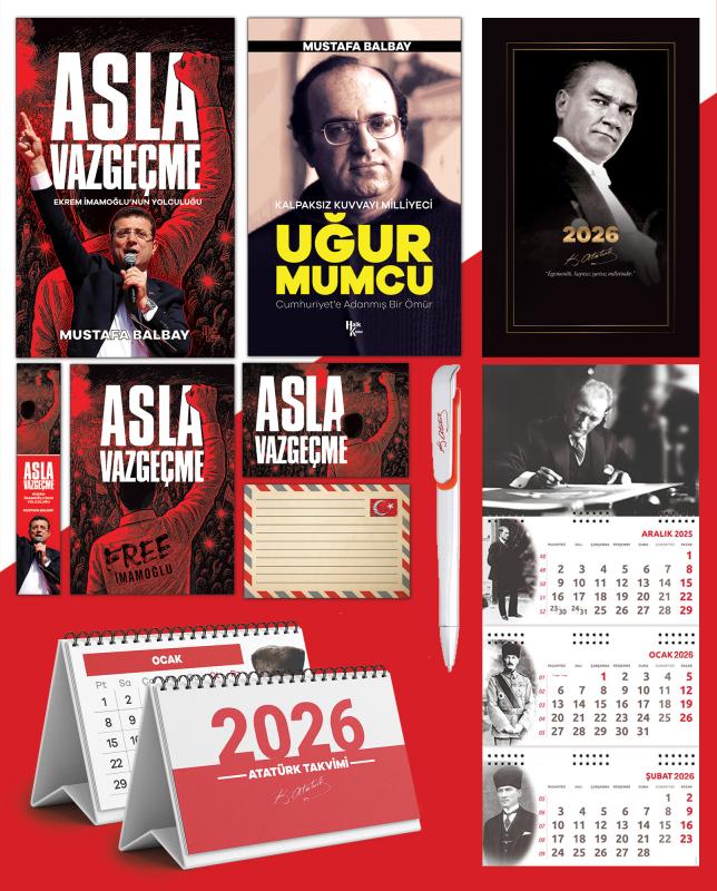 - ASLA VAZGEÇME - MUSTAFA BALBAY "Ekrem İmamoğlu, İstanbul Büyükşehir Belediye Başkanlığı'nı 2019 ve 2024'te üç kez kazandı. Her seferinde, “Daha fazlasını yapabilirim” mesajını verdi. 2023'te Cumhuriyet Halk Partisi'nde değişimin önünü açan kişi olarak, “Türkiye'yi de değiştireceğiz” diye haykırdı. Sırada cumhurbaşkanlığı vardı. Bu hedefe yürürken 23 Mart 2025'te tutuklandı. İmamoğlu önüne her engel konduğunda şöyle haykırdı: “Asla vazgeçmeyeceğim!” Bu söz aynı zamanda tüm Türkiye'ye idi. Tutuklanmasına giden yolla, cumhurbaşkanı adaylığına giden yol Silivri'de kesişti. Esareti göze alarak, cesareti örgütledi. Türkiye ayağa kalktı. CHP Genel Başkanı Özgür Özel, dipten gelen dalgayı uzun soluklu, iktidar hedefli bir yürüyüşe çevirdi. Mustafa Balbay, beş yıl hapis yattığı Silivri Cezaevi'nde İmamoğlu'yla üç kez görüştü. Mücadelesini kendi ağzından dinledi, yazdı. Bu kitapta, gerilimli, sürprizlerle dolu, macera romanlarını aratmayan olaylarla karşılaşacaksınız… Bu kitapta, pes etmeyi hafızasından silmiş, kararlı bir insanı daha yakından tanıyacaksınız… Bu kitapta, Silivri duvarlarına bakınca ufku gören bir liderin uzun yolculuğuna eşlik edeceksiniz…" UĞUR MUMCU - MUSTAFA BALBAY “Uğur, Bir Cumhuriyet Ordusudur. Uğur, Bir Kemalistti, Kuvvacıydı, Emekten Yanaydı, Sosyalistti. Bütün Bunlar Bir Arada Olur Mu, Sorusunun Cevabı Kendi Kişiliğiydi.” Ali Sirmen “Uğur, Müthiş Çalışkan Bir Adamdı. 1900'Lerde Doğsa, Kesin Sivas Kongresinde Olurdu. Uğur'un Cenazesi Bir Başka Doğumdur.” Altan Öymen “Uğur, Gelmiş Geçmiş En Büyük Gazetecidir. Gerçeği Yazma Konusunda Hiç Sansürü Yoktu. Çizgisi Sağlamdı, Haber Kaynakları Sağlamdı. Bilgili, Yürekli, Cesur, Katıksız Bir Atatürkçüydü.” Emin Çölaşan “Uğur'un Katli, Bir Karşı Devrim Hareketidir… Öngörüsü Çok Yüksekti. Bugünleri 1980'Lerde Gördü, Yazdı. Toplumu Aydınlatmayı, Bilgilendirmeyi Amaç Edinmiş, Tutkulu Bir Gazeteciydi.” Hasan Fehmi Güneş “Uğur Mumcu'nun İçinde Bir Yanardağ Coşkusu Vardı.” Rutkay Aziz “Uğurlar Olsun Türküsünü On Dakikada Besteledim. İçimden Dökülüverdi. Keşke Katletmeselerdi De Bestelemeseydim.” Selda Bağcan “Uğur Abi'ye Yardım Etmekten Büyük Onur Duyuyordum. O Bizim İçin En Güvenli Limandı.” Melih Yüzbaşıoğu 2026 Atatürk Ajandası • Günlük, haftalık ve aylık olarak bölünmüş • Her gün için Atatürk'ün bir sözü • Amerikan Bristol Kapak • 160 Sayfa • 70g kitap kağıdı 3 Parça Spiralli 2026 Atatürk Gemici Duvar Takvimi • Ürün Ebadı: 27,5x65 cm • Blok Ebadı: 27,5x13,5 cm • Üst Karton Ebadı: 27,5x20 cm • Yapraklar: 80 g 1. Hamur • Alt Karton: 350 g Bristol • Göstergeli 2026 Masa Takvimi Atatürk İmza Baskılı Kalem