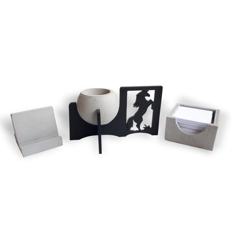 Beton Ofis Seti - Telefon ve Kartvizitlik, Standlı Küre Beton Saksı, Bloknotluk HK1704