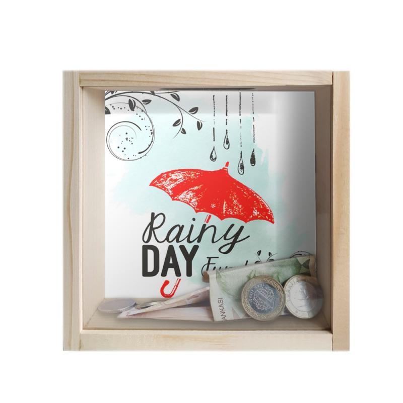 Camlı Ahşap Kumbara Kırmızı Şemsiyeli Ham Ahşap