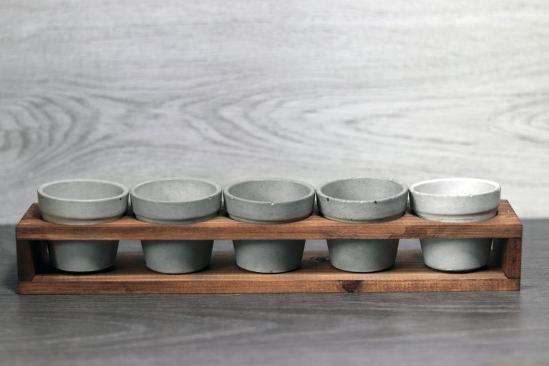 Ürün içeriği: 5 adet beton sukulent saksısı + ahşap stand