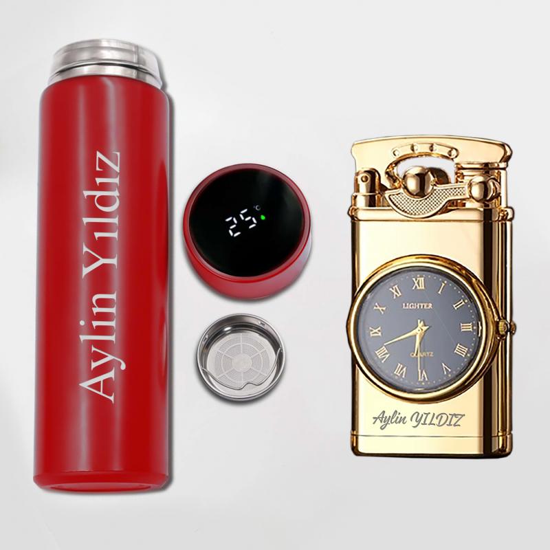 - Kişiye Özel Kırmızı Dereceli Termos ve Retro Gold Saatli Çakmak