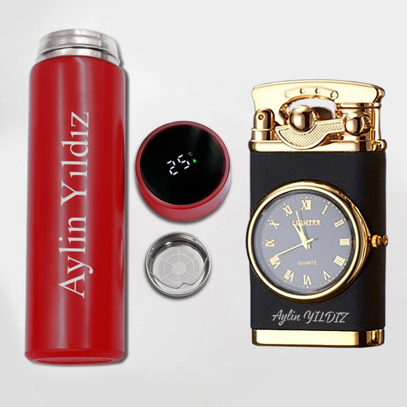 Kişiye Özel Kırmızı Dereceli Termos ve Retro Mat Siyah Saatli Çakmak