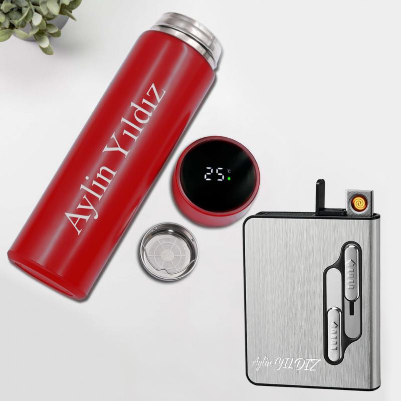 Kişiye Özel Kırmızı Dereceli Termos ve Şarjlı Çakmaklı Tabaka