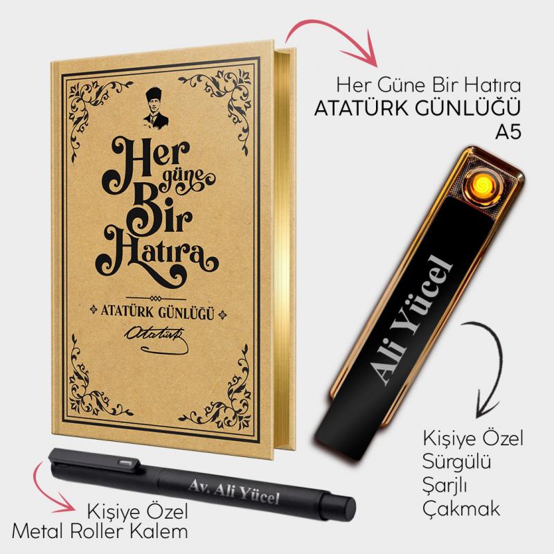 Kişiye Özel - Sürgülü Şarjlı Çakmak - Metal Roller Kalem ve Atatürk Günlüğü A5