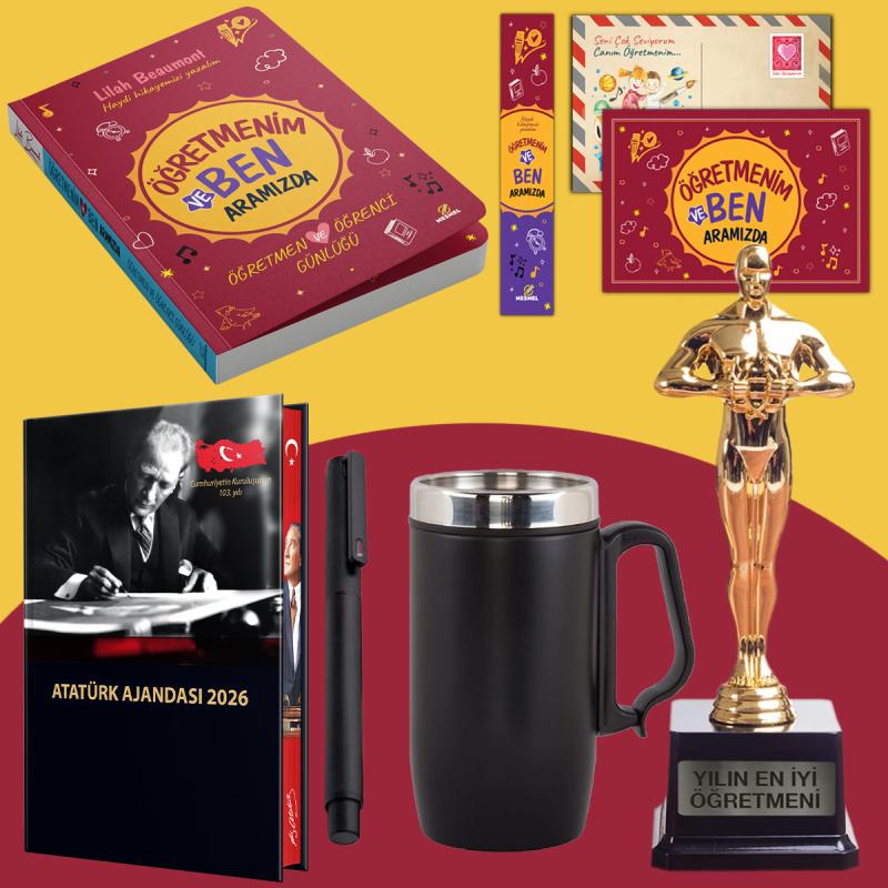 - Öğretmenim ve Ben Aramızda - Oscar Heykeli - Kulplu Termos - Ciltli 2026 Atatürk Ajandası ve Roller Kalem