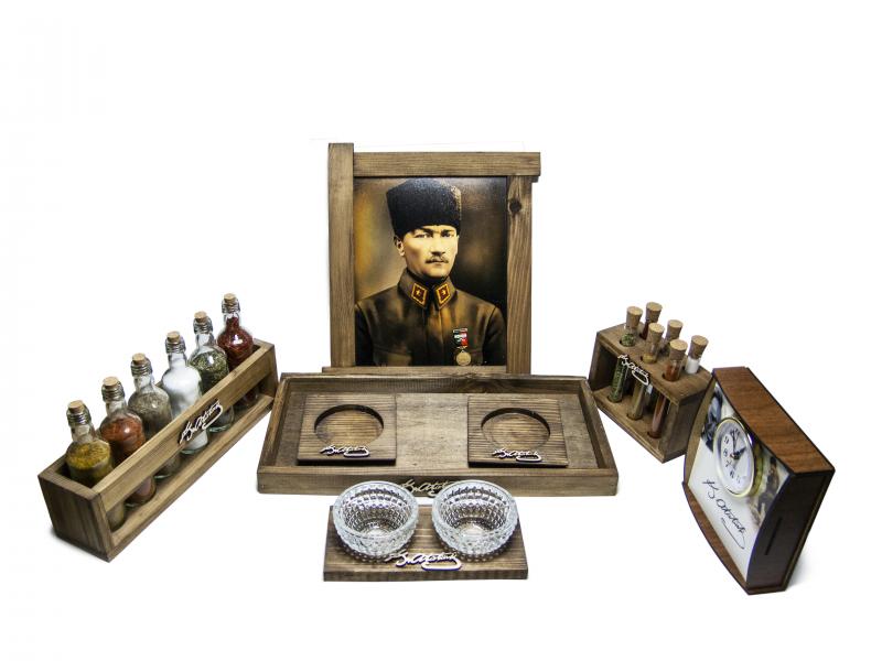 Özel Üretim içerisinde 6 adet ahşap ürünlerin bulunduğu K. Atatürk imzalı set.