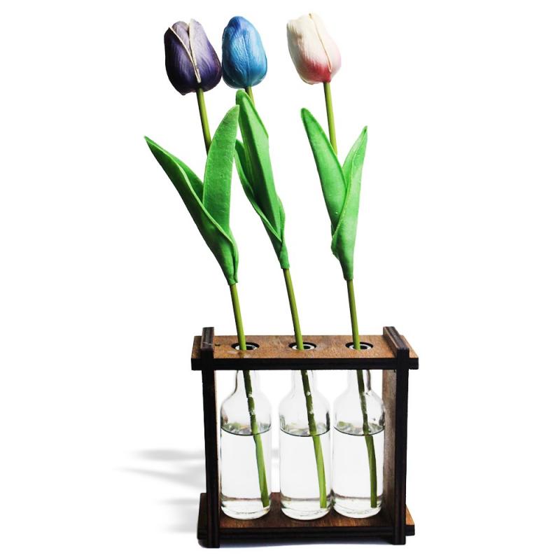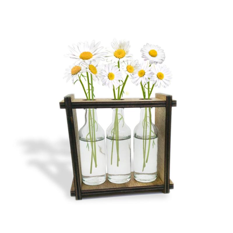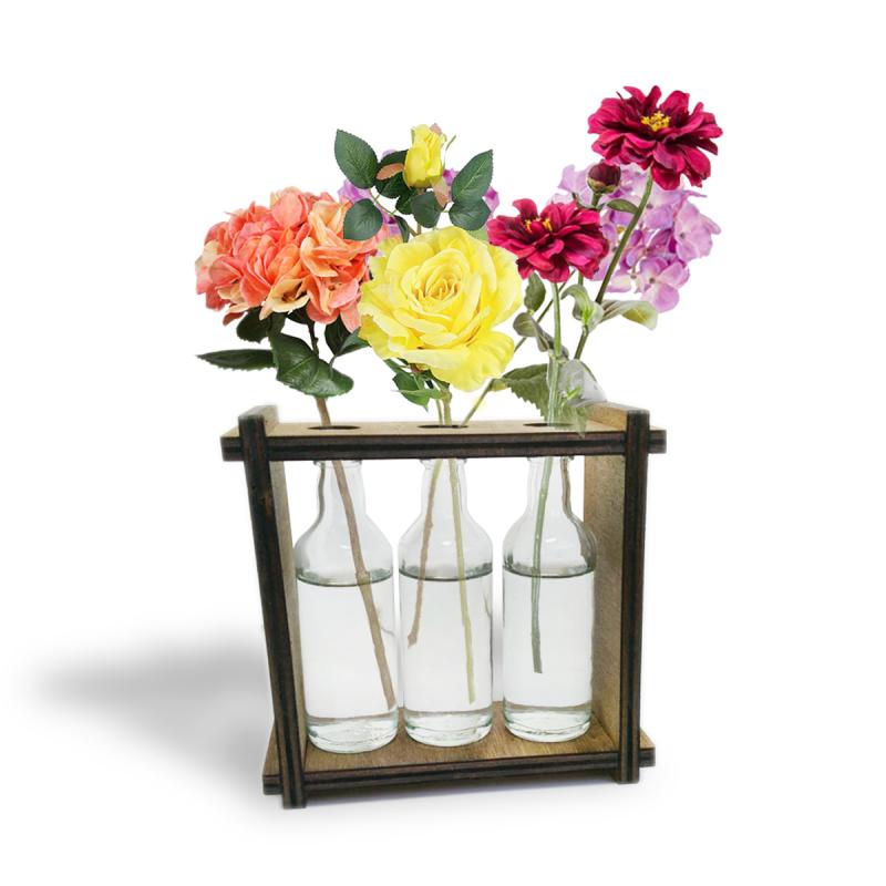 3'lü Ahşap Standlı Cam Şişe Saksı Seti , Çiçekler Ürüne Dahil Değildir.
