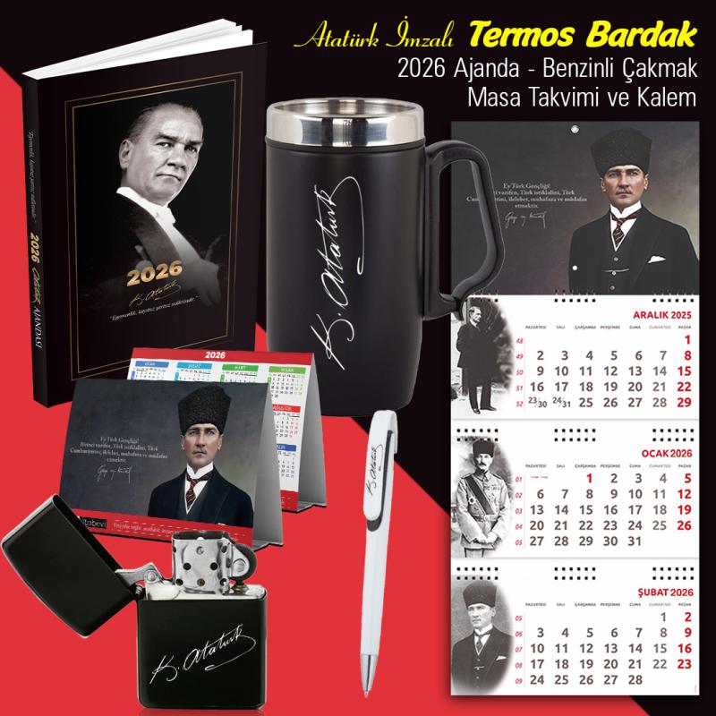 Atatürk İmzalı 2026 Ajanda - Termos Bardak - Duvar Takvimi - Masa Takvimi - Kalem - Benzinli Çakmak