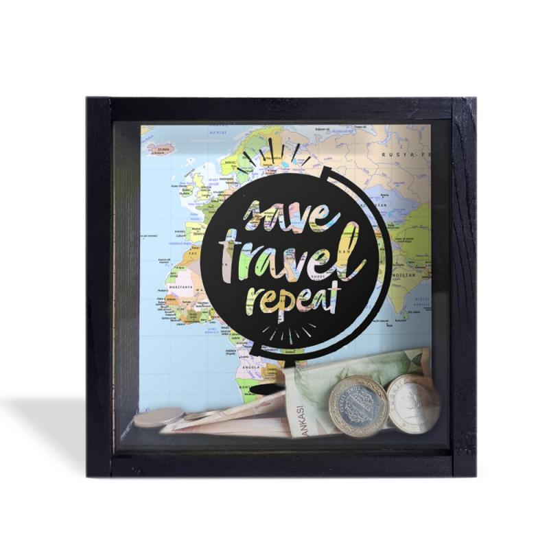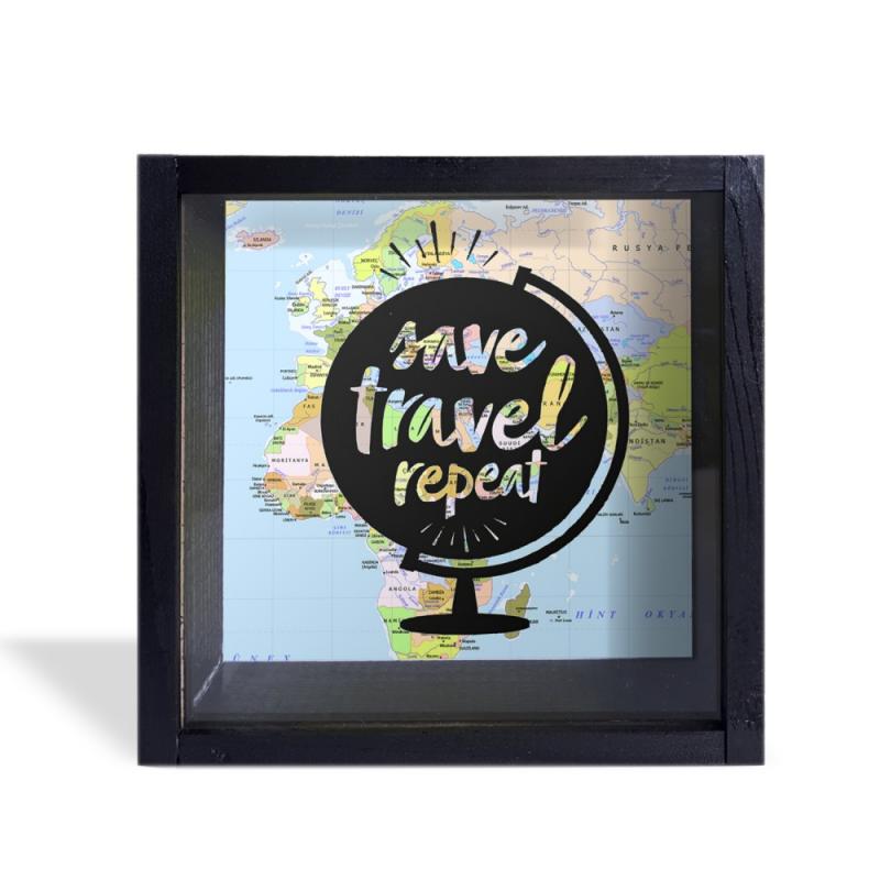 Camlı Ahşap Kumbara Dünya Turu Siyah