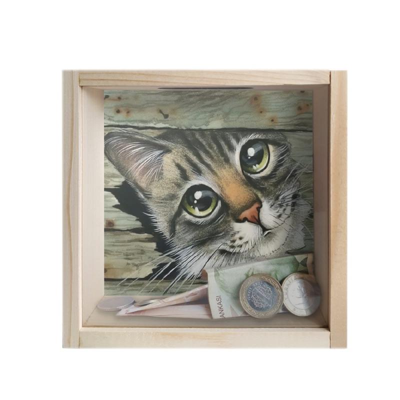 Camlı Ahşap Kumbara Kedicik Ham AhşapHK0660-HM