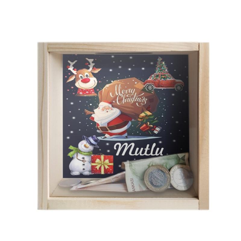 Camlı Ahşap Kumbara Mutlu Yıllar - Ham Ahşap
