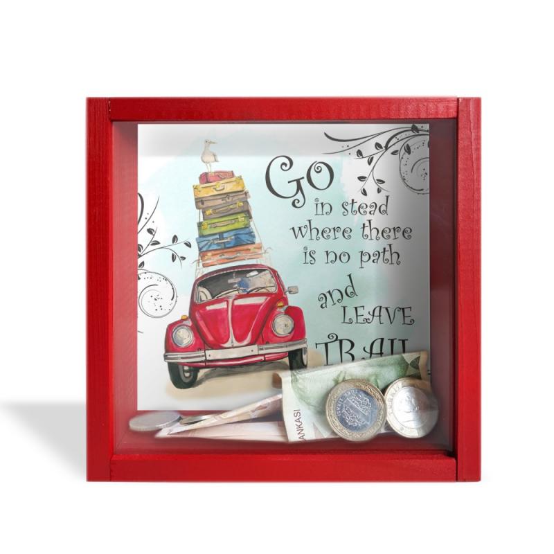 Camlı Ahşap Kumbara Tatil Kırmızı