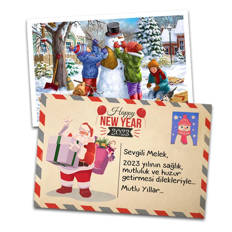 - Yılbaşı temalı ön yüz ve kendi notunuzun yazdığı baskılı arka yüz olmak üzere çift taraflıdır.