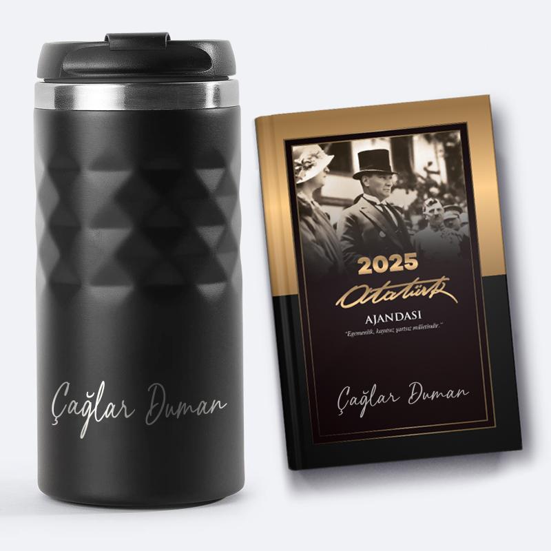 Kişiye Özel Siyah Spor Paslanmaz Çelik Termos 300 ml ve 2025 Ajanda - Asalet